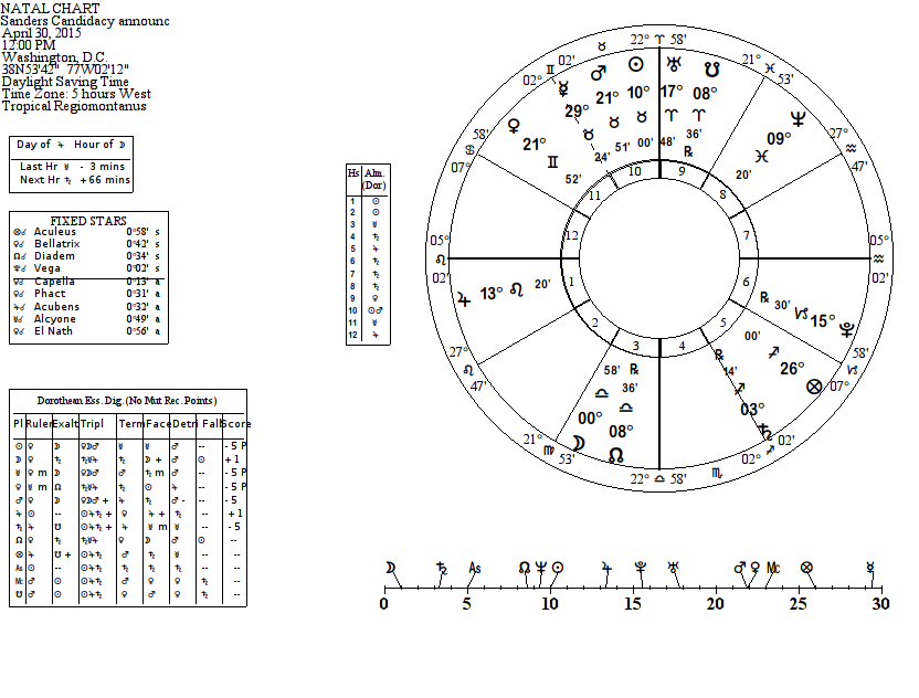 If the time is correct, or even a few minutes late, then Jupiter rules the Ascendant. For a judicial swearing in, the choice of planet would be highly appropriate: the "problem" is that Jupiter is peregrine, and in the 8th house. By this reckoning, Justice Kavanaugh truly becomes a hidden enemy of the Court (judicial matters are 9th, and his significator is in the 8th, which would be the 12th house from the 9th). One might also note that Jupiter is a generic marker for the nobility, so this also would describe his privileged upbringing. However, the fact that Jupiter is peregrine would show that while he came from privilege, he himself doesn't actually have it - meaning, he's got the background, but not the monetary resources.The late Ascendant suggests his time on the Court would be short, no more than a few years. The proximity of the Ascendant to the fixed star Sheat would make this appointment a shipwreck.